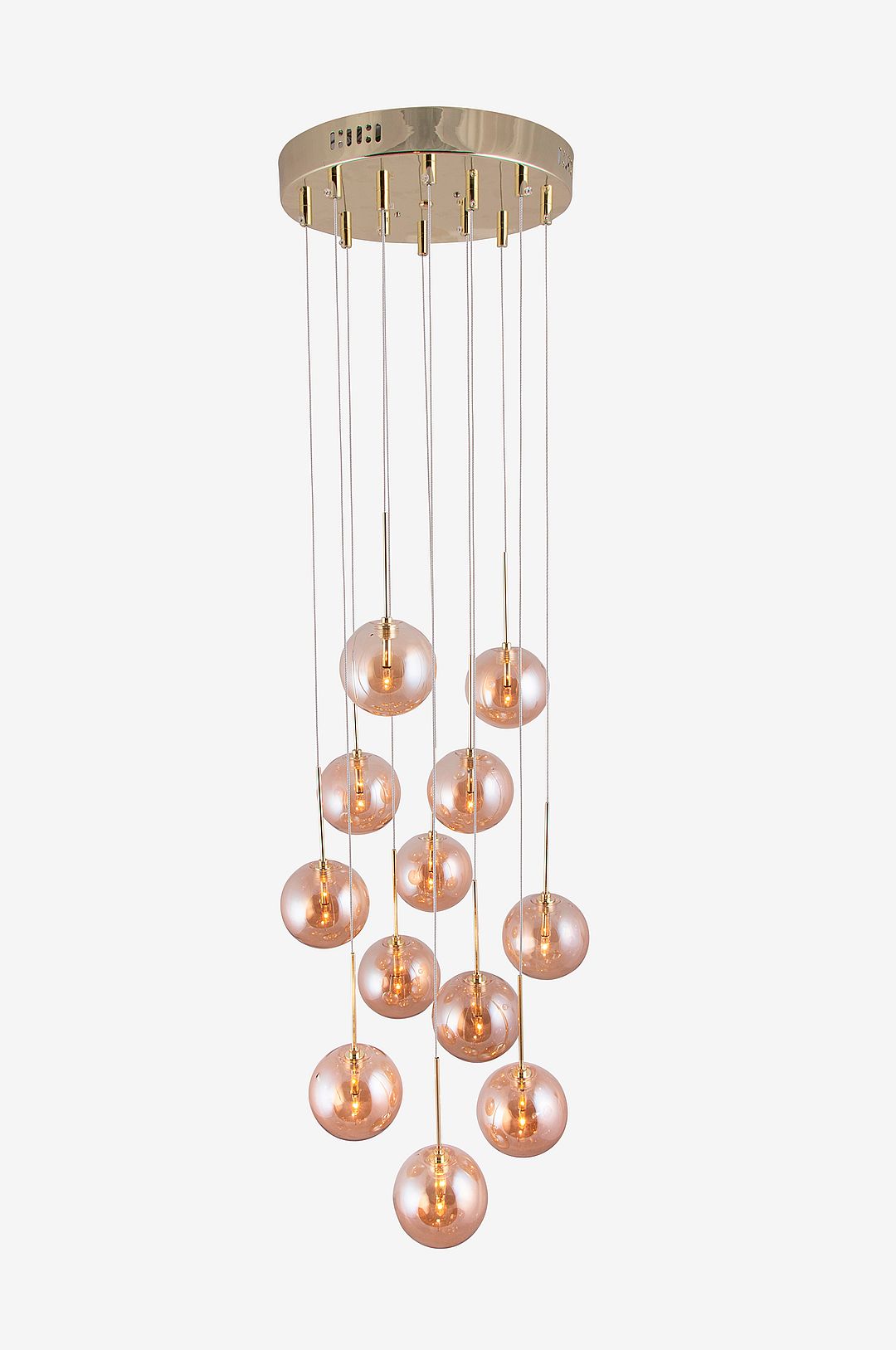 Lampans takplatta i mässingfärgad metall monteras med krokupphäng mot taket och har 12 vajrar med amberfärgade glaskupor. Minsta totalhöjd 33 cm och högsta totalhöjd 213 cm för att skapa ett intressant mönster med glaskuporna. Bredd: 30, Djup: 30, Höjd: längsta möjliga 213 (cm). Lamphållare: 12xG4. Max 10W. Rek. Ljuskälla: E58 (Medföljer ej). Takkontakt ingår ej på grund av nytt EU-direktiv. De finns att beställa separat. Jordad