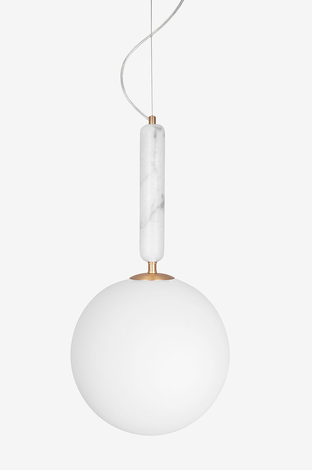 Torrano i vacker solid marmor blir en lyxig inredningsdetalj som verkligen tar plats i rummet. De runda formerna tillsammans med den hårda marmorstenen bildar en spännande kontrast. Denna lampa är gjord i solid marmor, har en glaskupa i vitt opalglas, metalldetaljer i färgen borstad mässing samt en 120 cm lång transparent kabel och vajer samt matchande takkopp i färgen borstad mässing. Design, Patrik Hall. Bredd 30 cm, djup 30 cm och höjd 60 cm. Lamphållare 1xE14. Max 40W. Ljuskälla ingår ej. Takkontakt ingår ej på grund av nytt EU-direktiv. Takkontakt finns att beställa separat. Ojordad.