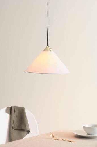 Taklampa av mässingspläterad järn med konformad lampskärm av bomull. MICKAN är en enkel och diskret lampa som är lättplacerad. PVC-sladd. Lampan är ojordad, klass 2. På grund av EU-regler behövs en separat takkontakt i vissa länder. Takkontakten ska vara ojordad (klass 2) och köps separat. Material: Järn, bomull och PVC. Storlek: Total höjd 40 cm. Skärm: Höjd 23 cm, ø 35 cm. Fot: ø 20 cm. Sockel/lampa: 1 st E27, max 40 w. Ljuskälla medföljer ej.