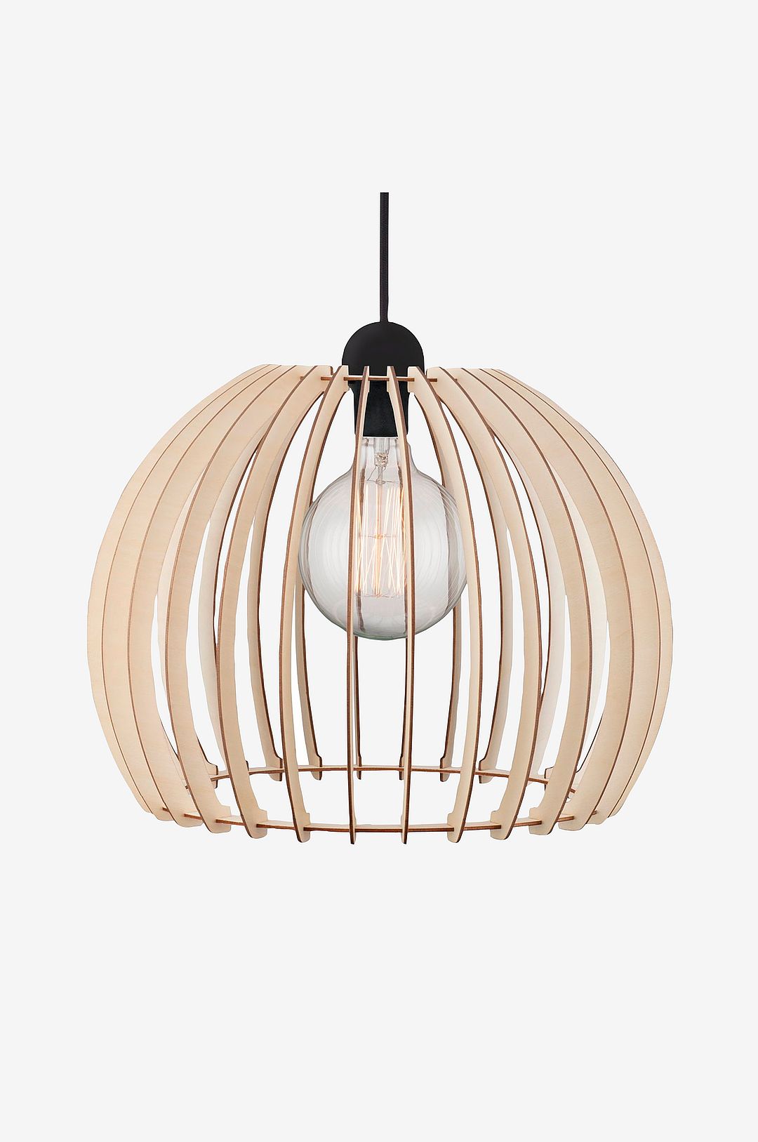 Taklampa i grafisk design med skärm av trälameller som ger en behaglig ljusspridning. Eftersom ljuskällan är synlig mellan lamellerna, rekommenderar vi att lampan kompletteras med en dekorativ glödlampa. Lampan är bland annat perfekt över köksbänken eller matbordet och levereras utan ljuskälla.