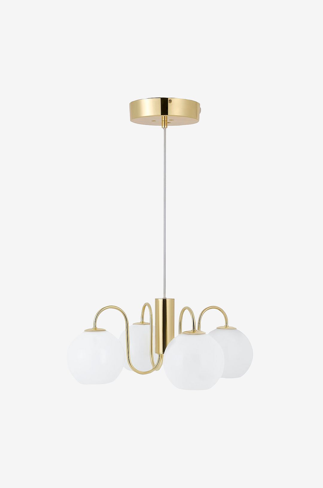 Franca-serien har en exklusiv och elegant design med vackert skinande glas och blank mässing. Pendeln är inspirerad av den klassiska ljuskronan och har vintagedetaljer med en modern twist. De vita glaskupolerna skapar ett mjukt och diffust ljus. glaset i den här lampan är munblåst och har tillverkats individuellt för hand. På grund av denna unika process kan luftbubblor uppstå i glaset och dessutom kan glasets tjocklek variera. Detta ger glaset dess karaktär och levande utseende.