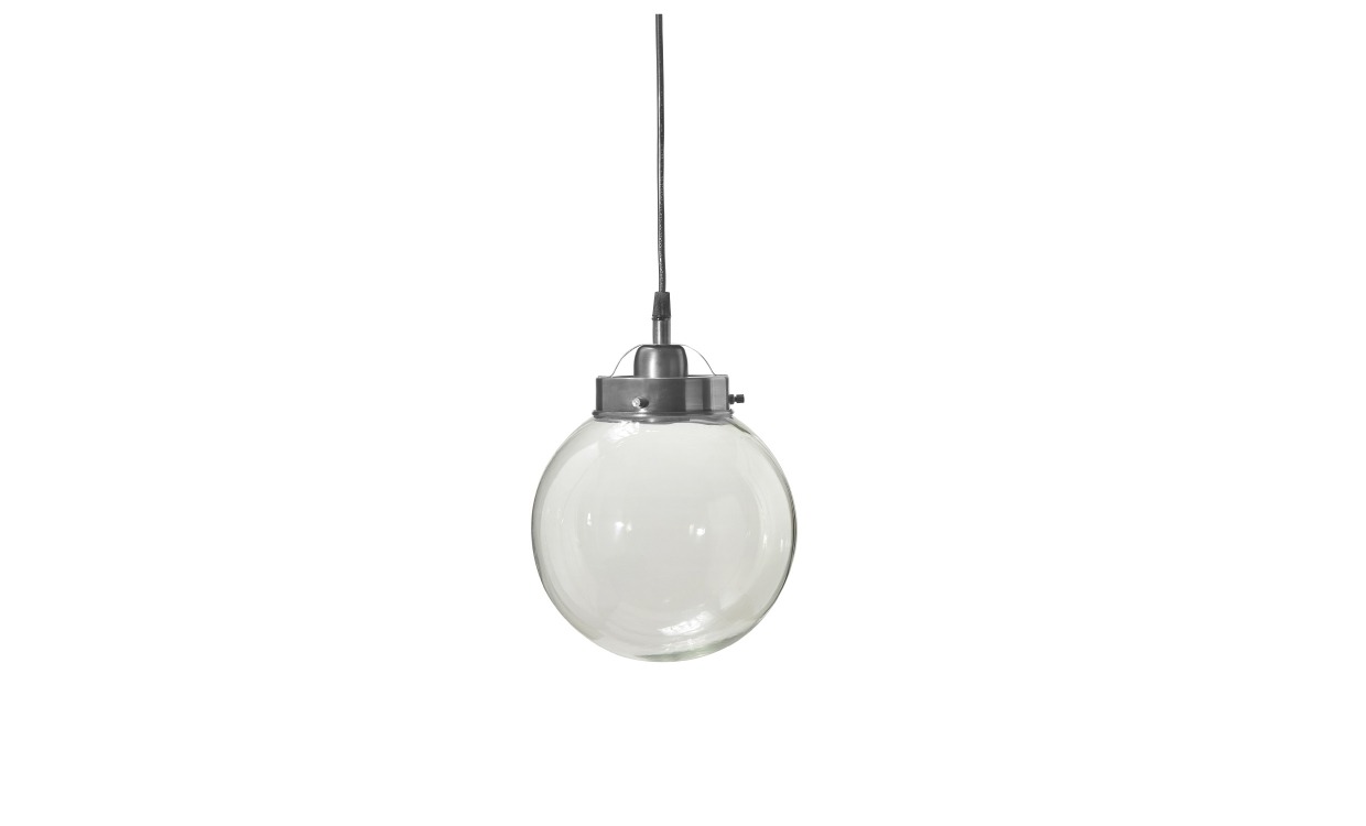 Vacker och ståtlig taklampa i klotformation av glas. Upphänge i antiksilver med matchande takkopp och 1,6 m svart sladd. En härlig kombination är att placera fler lampor tillsammans i antingen samma storlek eller växlande då lampan finns i tre olika storlekar. Vi rekommenderar att köpa till en dekorativ LED-lampa som ger ifrån sig ett vackert och varmt ljus då ljuskälla ej medföljer. Kolla i vårt sortiment efter vilken ljuskälla som passar just dig.Design & egenskaperStilren taklampa i rund design.Tillverkad i metall och glas.Plastsladd 1,6 m i svart med krokupphängning.E27, max 40W. Ljuskälla och lamppropp med sladd ingår ej.