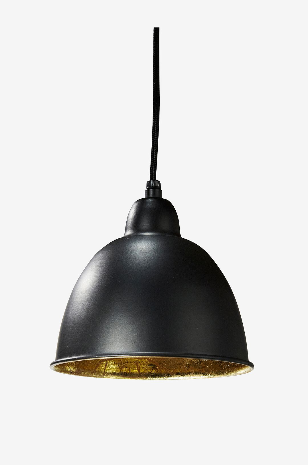 Taklampa i metall, komplett med kronkontakt. Svart med guldfärgad insida. Takkopp i metall med fäste för takkrok. 18 cm i diameter, höjd 17 cm. Sladdlängd 100 cm. E27 max 40W.Takkontakt ingår ej på grund av nytt EU direktiv. De finns att beställa separat.