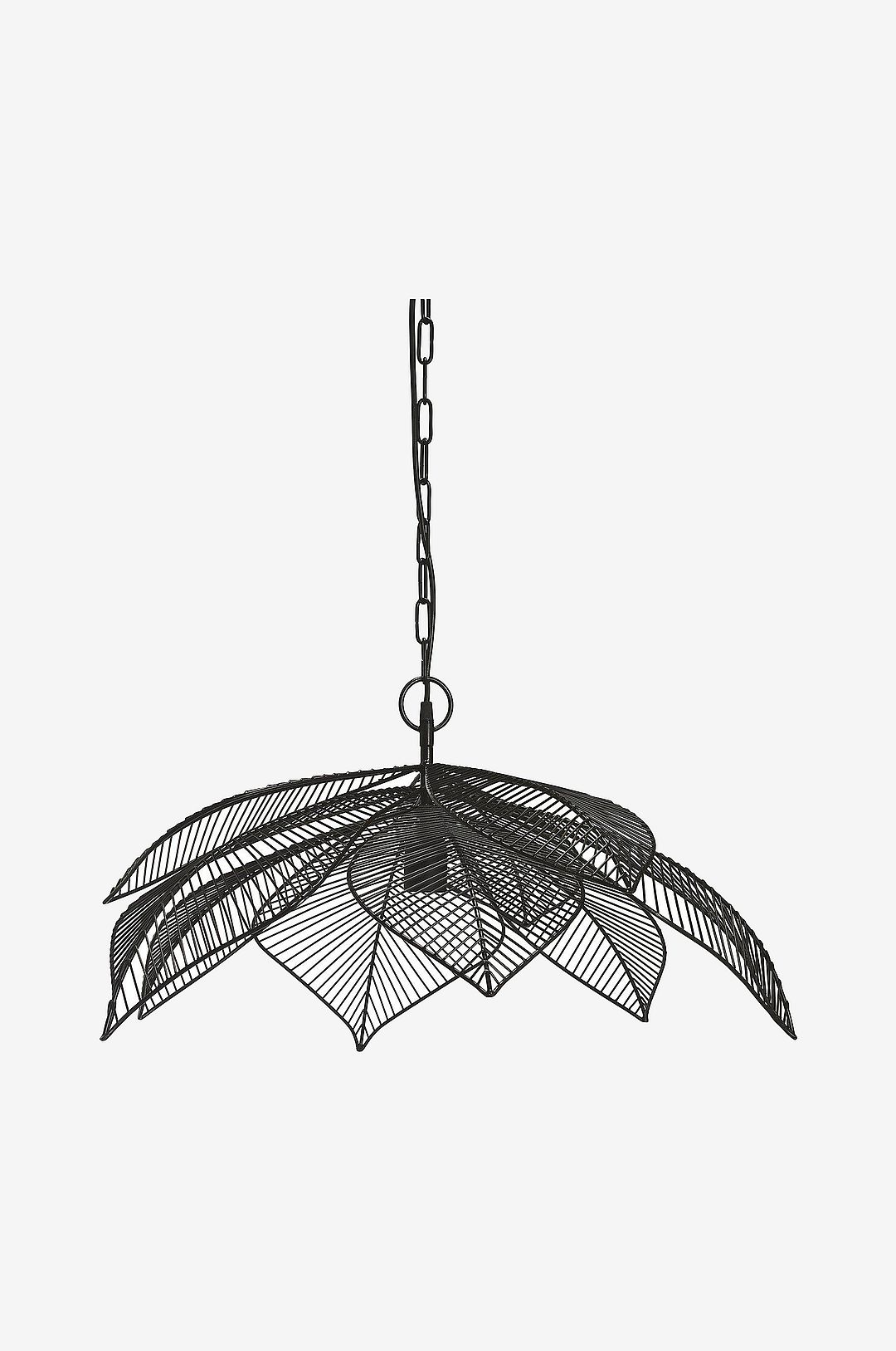 Taklampa Elm av metall är en pendel där vi hämtat inspiration från almlöv som lagts lager på lager för att skapa ett vackert ljusspel. Matt svart finish. 80 cm svart kedja med takklopp för krokupphäng. Takkoppens diam är 9 cm. 100 cm svart plastsladd. Diameter 70 cm, skärmens höjd är ca 35 cm. E27 sockel. Max 40W. Jordad. IP20. Ljuskälla och takkontakt ingår ej.