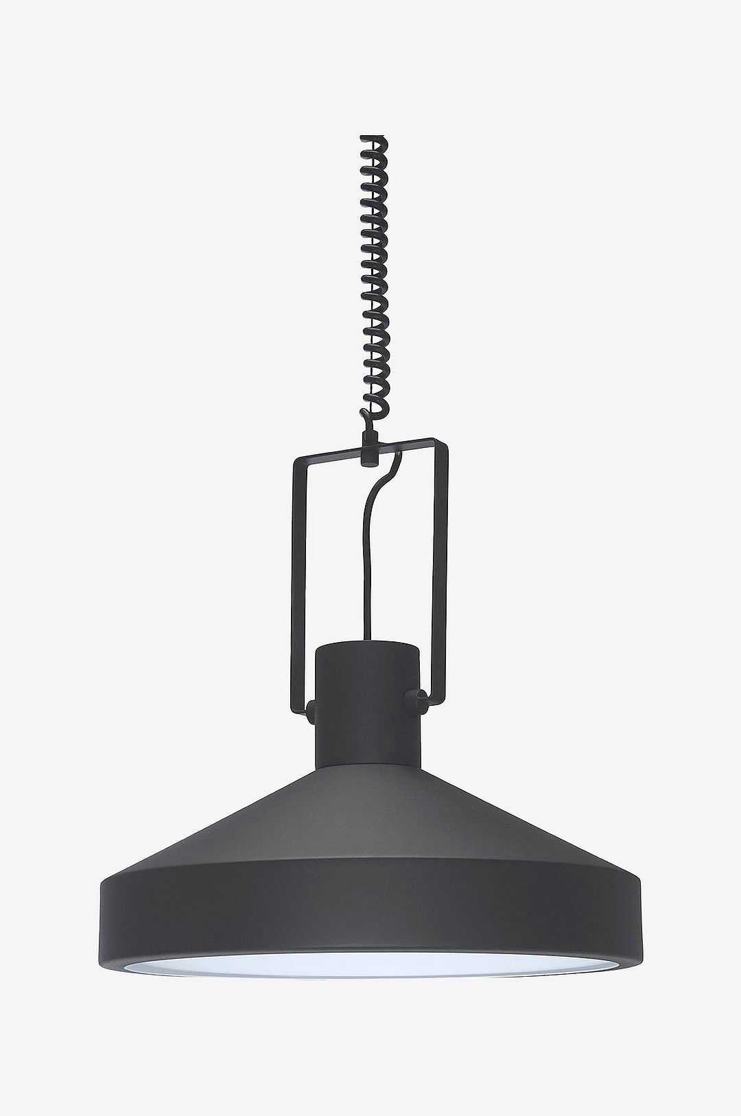Taklampa Jojo i metall och matt yta. Lampan kommer med justerbar sladd där det är lätt att själv välja höjden efter behov. Svart sladd 100-180 cm och svart takkopp. Denna armatur har fast installation, det finns en utgång från takkoppen för att göra en smidig förlängning av kabel vid behov. Passar till ljuskälla med E27 fattning, max 40watt. Det medföljer en diffuser som ger ett behagligt sken. Ljuskälla och takkontakt köpes separat. Mått: Höjd 26 cm, diameter 40 cm.