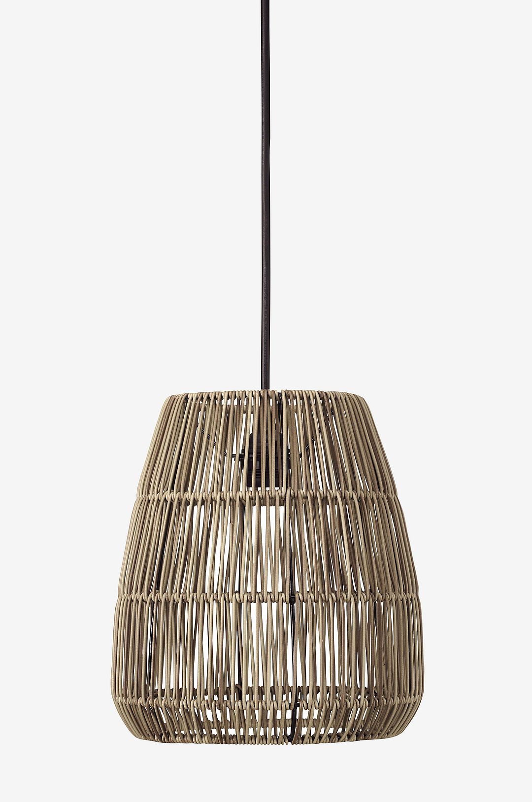 Saigon, en lampskärm i konstrotting. Konstrotting är ett tåligt material som klarar väder och vind. Den flätade strukturen skapar ett vackert ljusspel. Takskärmen säljs tillsammans med ett svart takupphäng för inomhus bruk. 1,2m med e27 lamphållare och takkopp för krokupphäng. Max 40w. Ip20. Ljuskälla och takkontakt ingår ej.