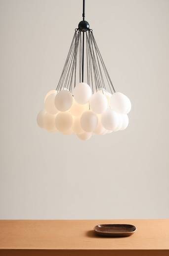 Taklampa med 37 runda klot av opalglas, i sex av kuporna finns en ljushållare vilket gör att lampan sprider ett behagligt sken. Kuporna hänger i en härlig klunga och bildar en pampig och spännande taklampa över ditt matsalsbord till exempel. Stommen och takkoppen är av järn. Lampan är jordad, klass 1. På grund av EU-regler behövs en separat takkontakt i vissa länder. Takkontakten ska vara jordad (klass 1) och köps separat. Material: Järn och glas. Storlek: Höjd 120 cm, bredd 77,7 cm, djup 80 cm. Varje kupa: Höjd 15 cm, ø 12 cm. Sockel/lampa: 6 st E27, max 60 w. Ljuskällor medföljer ej. Tips/råd: Med varierande färg och styrka på ljuskällorna får lampan spännande effekt.