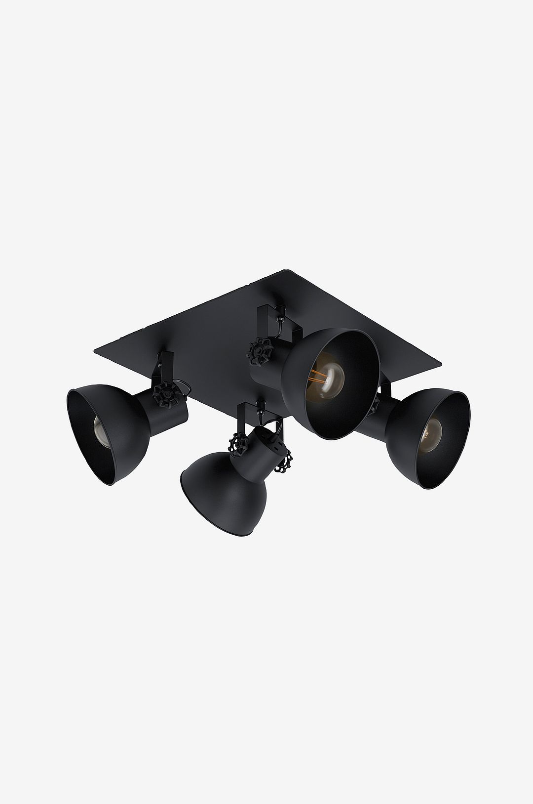 Taklampan barnstaple 1 är tillverkad i svart metall med fyra justerbara svarta lamphuvuden och kompletterar moderna interiörer i industriell stil. Med sina svängbara lamphuvuden fungerar taklampan perfekt i alla utrymmen, oavsett om det är köket, vardagsrummet, sovrummet, hallen eller matsalen. Produkten kräver 4 x e27-glödlampor som inte ingår.