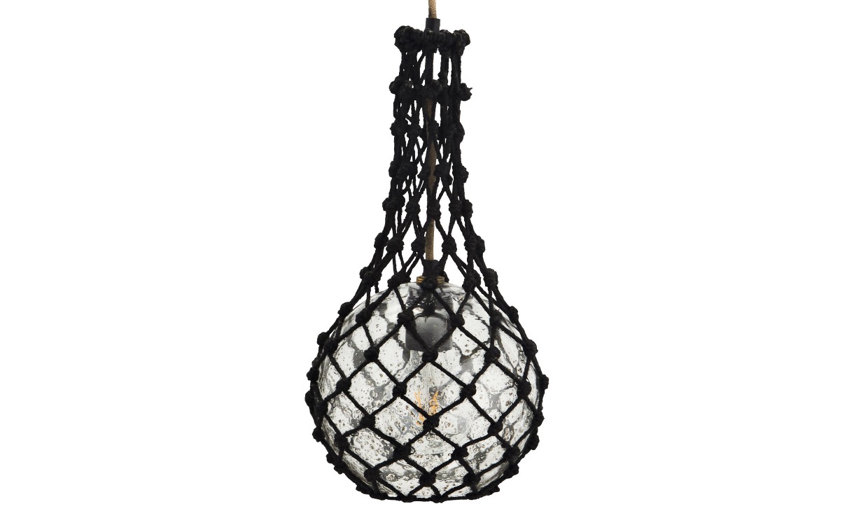 Den här unika taklampan ger ditt rum en mysig och stilfull känsla. Lampan har en rund glaskupa som omges av ett handknutet nät vilket skapar ett fint ljus och en rustik look. Denna är perfekt för vardagsrummet, sovrummet eller över matbordet.Design & egenskaperUnik taklampa från Madam Stoltz.Glaskupan omges av ett handknutet nät. 2 meter sladd medföljer.E27, max 40W.Har dimensionerna: D20x40 cm.