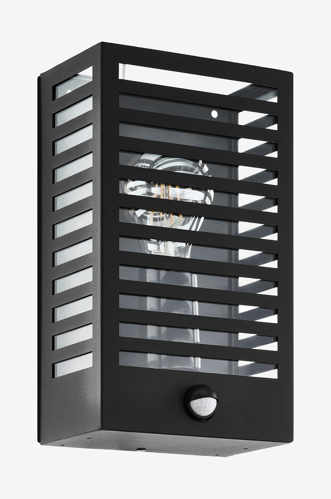 Den utvändiga vägglampan alamonte 3 har en kubformad metallram med klara glaspaneler. Den randiga designen fulländar lampans distinkta utseende samtidigt som den skapar en behaglig atmosfär och ger ett indirekt ljus. Vägglampan är också utrustad med en rörelsesensor och tänds automatiskt, vilket lyser upp områden med dålig sikt och avskräcker oönskade besökare. Den integrerade skymningssensorn mäter den omgivande ljusnivån, så att lampan bara tänds när det behövs. Med ip44-skydd mot stänkvatten är denna ytterbelysning lämplig för utomhusbruk och passar utmärkt in i moderna utomhusområden. Produkten kräver 1 e27-glödlampa som inte ingår.