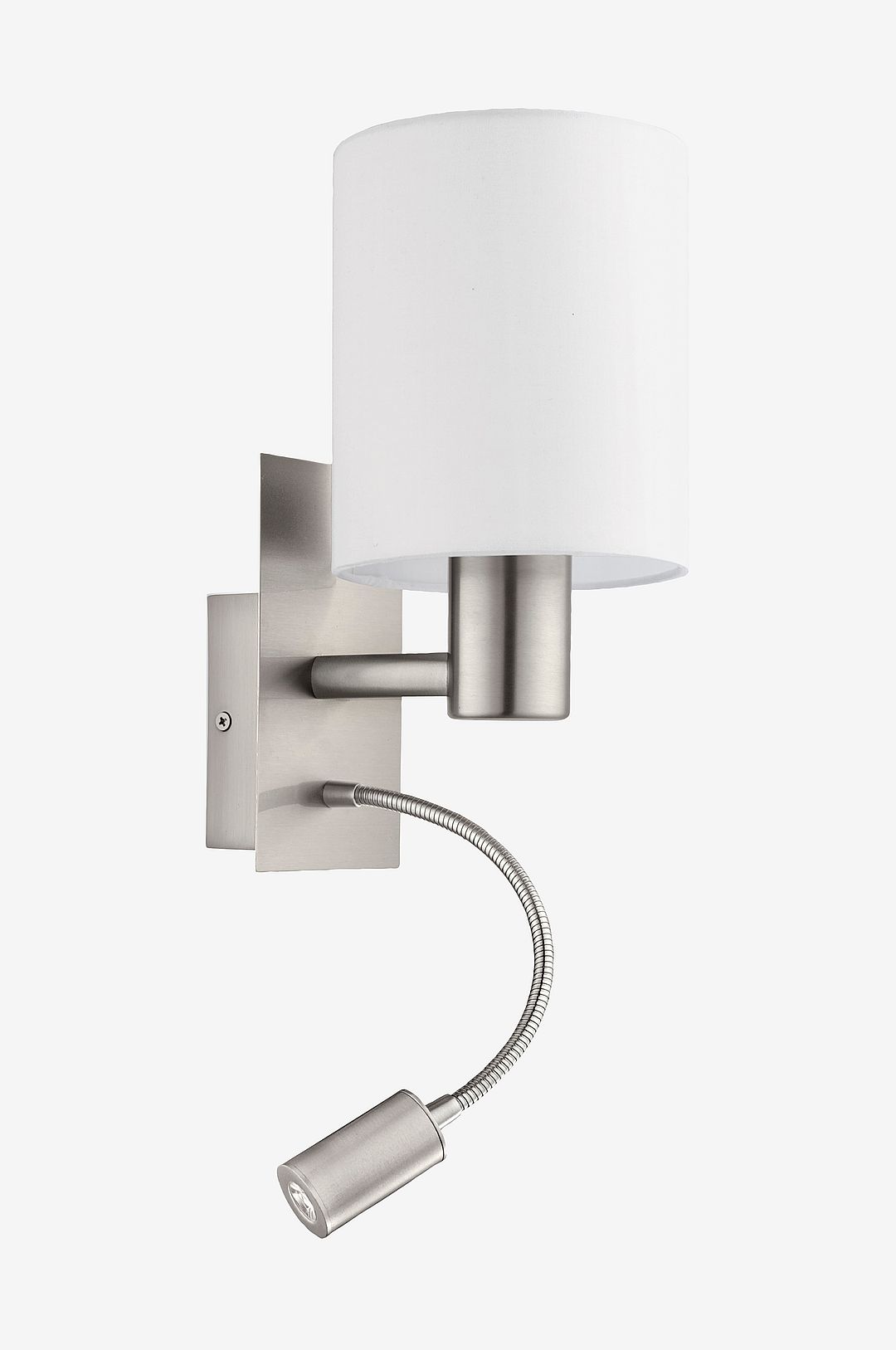 Vägglampan pasteri har en stomme i matt nickelmetall och en rund lampskärm i tyg i färgerna vit, brun eller grå. Vägglampan har en justerbar läslampa som avger ett varmvitt ljus för att ge en fokuserad belysning. Produkten har en enkel design som smälter sömlöst in i nästan alla inredningstrender. Den kan enkelt tändas och släckas med hjälp av vippströmbrytaren på kroppen. Oavsett om det är i sovrummet eller vardagsrummet ger produkten mysig och praktisk belysning för din bostad. Produkten har en e27-lamphållare och kräver 1 x e27-glödlampa, som inte ingår.