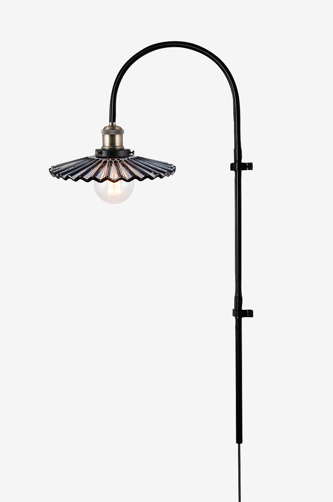 Cobbler är en ny version av en klassisk skomakarlampa som passar perfekt i flera olika inredningar. I det moderna lantliga hemmet eller sekelskifteshemmet, men också i den franska bistroinredningen. Lampan har en skärm av plisserat glas som ger en vacker ljusspridning i det räfflade glaset. Glasskärmen matchas med detaljer i matt svart och antik mässingsfärgad metall. Väggfästet har två metallklämmor med medföljande skruvar för montering på väggen och hela lampan är justerbar i sidled. Skärmens diameter är 25 cm och lampans totala djup från väggen är 38 cm. Lampan har en 200 cm lång svart textilkabel med strömbrytare och europakontakt.