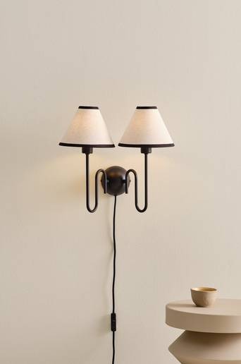 Vägglampan Juliet har två snirklade armar i lackad metall med textilskärmar i naturlinne och kontrasterande kantband i samma färg som armarna. Från väggplattan löper en textilkabel i samma kulör som den lackade ytan. Detta är en lampa som drar till sig uppmärksamhet och skapar en fin varm miljö där du placerar den. Lika fin ovan en köksbänk som i en hall eller som ett blickfång i ett vardagsrum. Material lampfot: järn. Material lampskärm: lin. Längd/Djup: 15.0 X Bredd: 36.0 X Höjd: 36.0 cm. Lampskärm: ø 18 cm, höjd 13 cm. Sockel: E14. Effekt max: 25 w. Antal ljuskällor: 2 . Ljuskälla ingår ej. Monteringsanvisning medföljer.