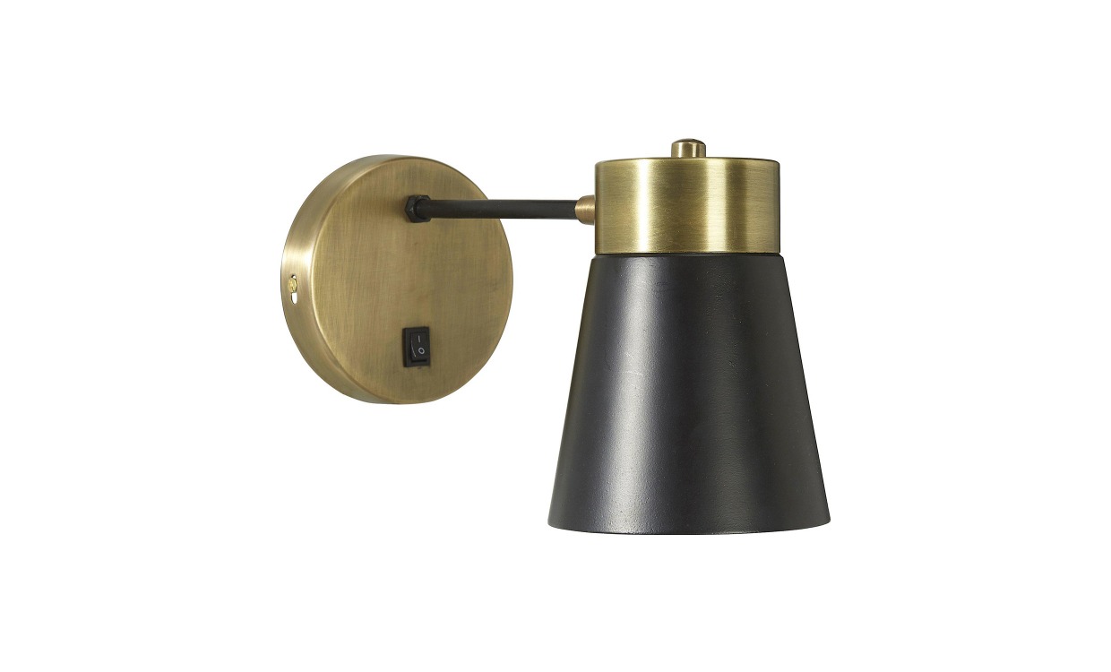 Vägglampa i en härlig kombination av metall med matt svart lack och antikmässing finish. Lampan har justerbar skärm och trömbrytare på väggfästet. En stilren design som gör att vägglampan passar i många miljöer.