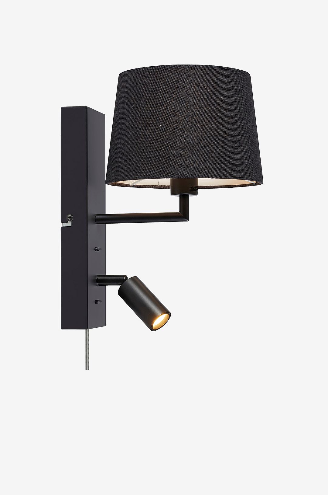 Como vägglampa från Markslöjd. Bas i metall och skärm i textil. Separata brytare på väggplattan. 1xE14, max 40W. Läslampa LED 3W. 2m pvc kabel och väggkontakt. Kopplingsbox i plattan för att enkelt kunna montera på direkt kommande el. Monteras med bygel. Ljuskälla E14 ingår ej.