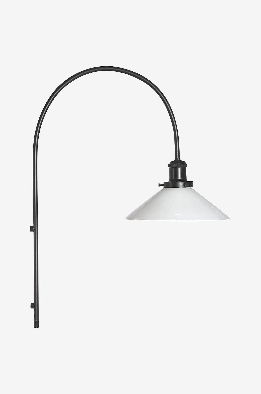 August vägglampa med metallbåge och skärm i glas. Glasskärmen fästes i en lamphållare i borstad metall. Lampan monteras enkelt i väggen med ett stilrent fäste som skruvas fast. Sladden är 2 meter lång med väggkontakt och strömbrytare som sitter 55 cm från nedre delen av metallbågen. Lamphållaren sitter 20 cm från bågens topp. Skärmen är 25 cm i diameter och höjd 9,5 cm. Ljuskälla köpes separat.