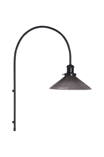 August vägglampa med metallbåge och skärm i glas. Glasskärmen fästes i en lamphållare i borstad metall. Lampan monteras enkelt i väggen med ett stilrent fäste som skruvas fast. Sladden är 2 meter lång med väggkontakt och strömbrytare som sitter 55 cm från nedre delen av metallbågen. Lamphållaren sitter 20 cm från bågens topp. Skärmen är 25 cm i diameter och höjd 9,5 cm. Ljuskälla köpes separat.