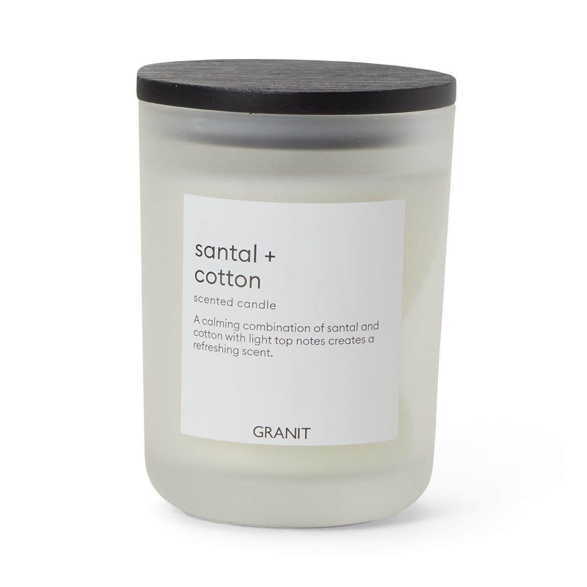 Dekorativt doftljus i en frostad glasbehållare med ett FSC-certifierat svart trälock. Doft: En lugnande kombination av santal och bomull, med blommiga toner av lavendel och jasmin. Fräscha och lätta toppnoter skapar en uppfriskande doft. Elda ljus på en plan, värmetålig yta och se till att det är 10 cm mellan brinnande ljus. Sluta använda ljuset när det återstår 1,5 cm av veken. Släck alltid noggrant om det finns minst 6 mm vax kvar. Elda inte ljuset längre än 4 timmar åt gången och undvik drag, direkt solljus och värme. Klipp veken till 1 cm innan du tänder den och håll den centrerad. Om lågan blir för stor eller röker, släck ljuset, låt det svalna, klipp veken och tänd om. Håll vaxpoolen fri från skräp och tändstickor för att undvika faror. Flytta inte ett brinnande eller nyss släckt ljus och undvik att hälla varmt vax.