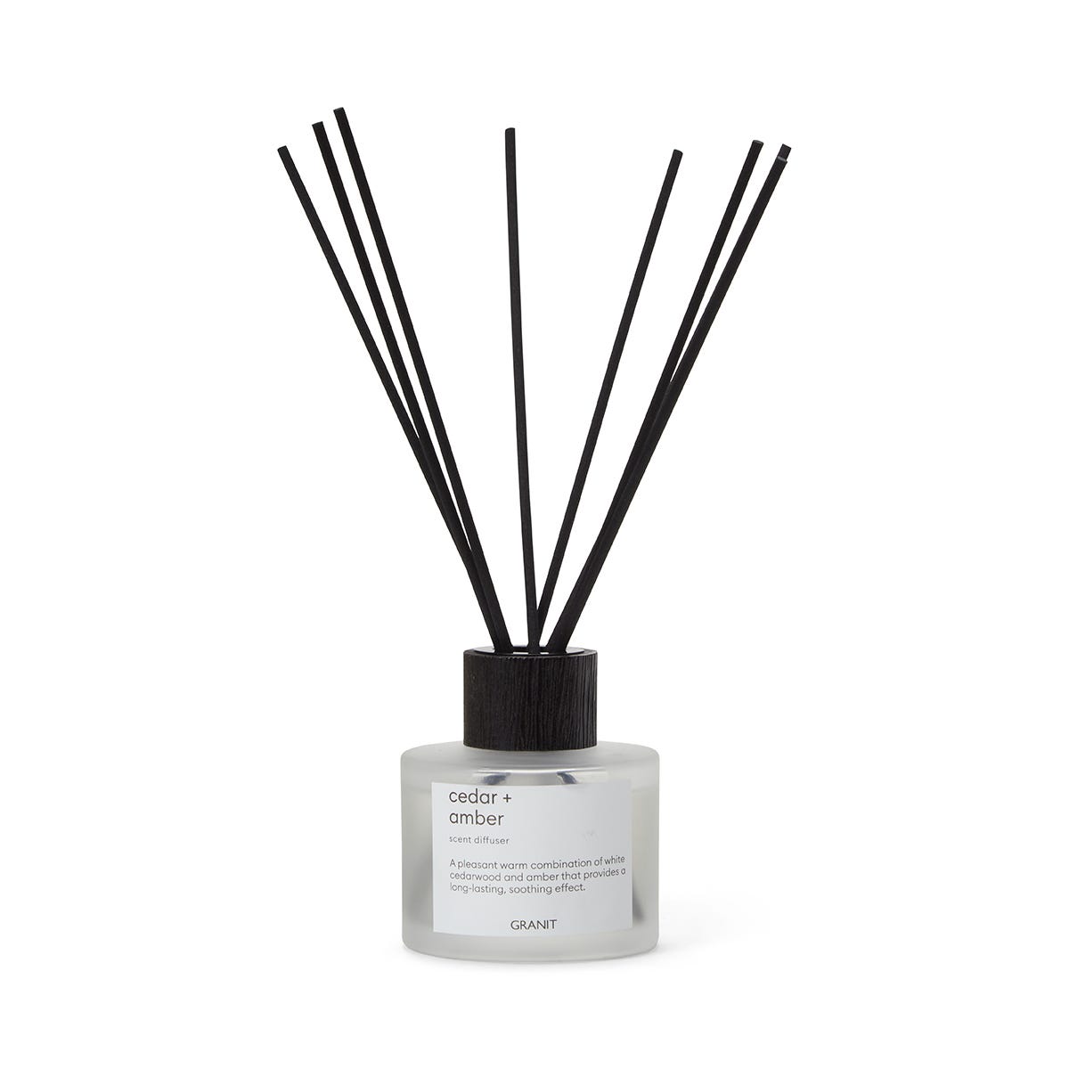 Doftpinnar som sprider en härlig doft i rummet. Flaskans frostade glas och de svarta doftpinnarna gör den till en snygg dekoration i ditt hem. Doft: En behaglig varm kombination av vitt cederträ och bärnsten som ger en långvarig, lugnande effekt. Kan orsaka allergisk hudreaktion. Placera inte nära öppen låga. Bränn inte pinnarna. Förtär inte. Förvaras utom räckhåll för barn och husdjur. Blanda inte med andra kemikalier. Se till att de blöta pinnarna inte kommer i kontakt med tapeter eller gardiner. Olja eller färg kan orsaka fläckar. Undvik kontakt med ögon, hud, tyg och fin eller polerad yta. Oljor i flaskan kan fläcka möbelytan, placera aldrig flaskan direkt på möbeln.