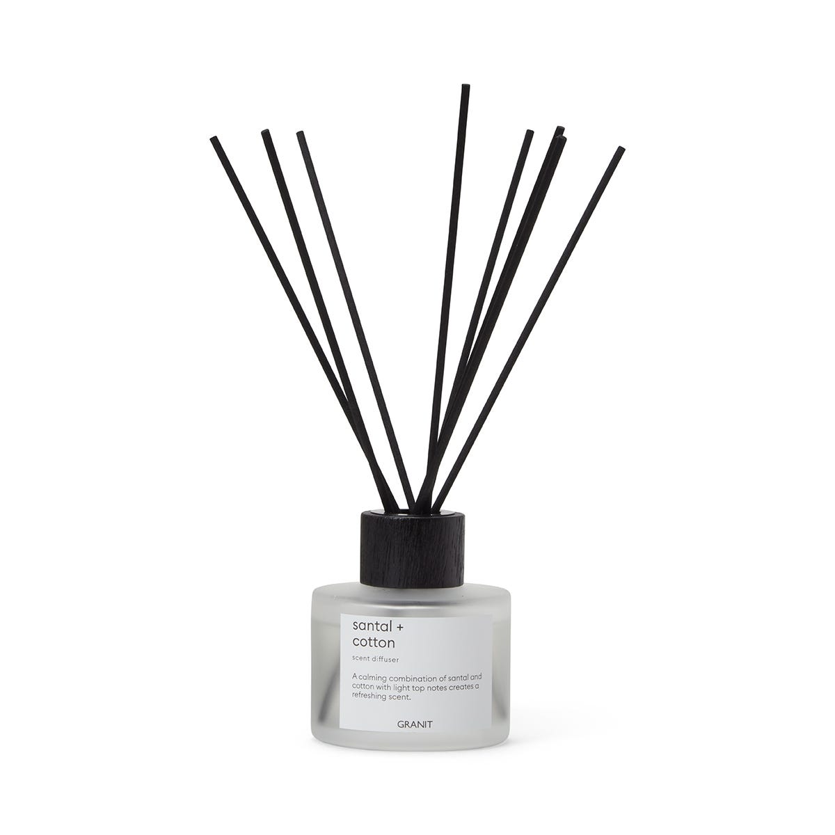 Doftpinnar som sprider en härlig doft i rummet. Flaskans frostade glas och de svarta doftpinnarna gör den till en snygg dekoration i ditt hem. Doft: En lugnande kombination av santal och bomull, med blommiga toner av lavendel och jasmin. Fräscha och lätta toppnoter skapar en uppfriskande doft. Kan orsaka allergisk hudreaktion. Placera inte nära öppen låga. Bränn inte pinnarna. Förtär inte. Förvaras utom räckhåll för barn och husdjur. Blanda inte med andra kemikalier. Se till att de blöta pinnarna inte kommer i kontakt med tapeter eller gardiner. Olja eller färg kan orsaka fläckar. Undvik kontakt med ögon, hud, tyg och fin eller polerad yta. Oljor i flaskan kan fläcka möbelytan, placera aldrig flaskan direkt på möbeln.