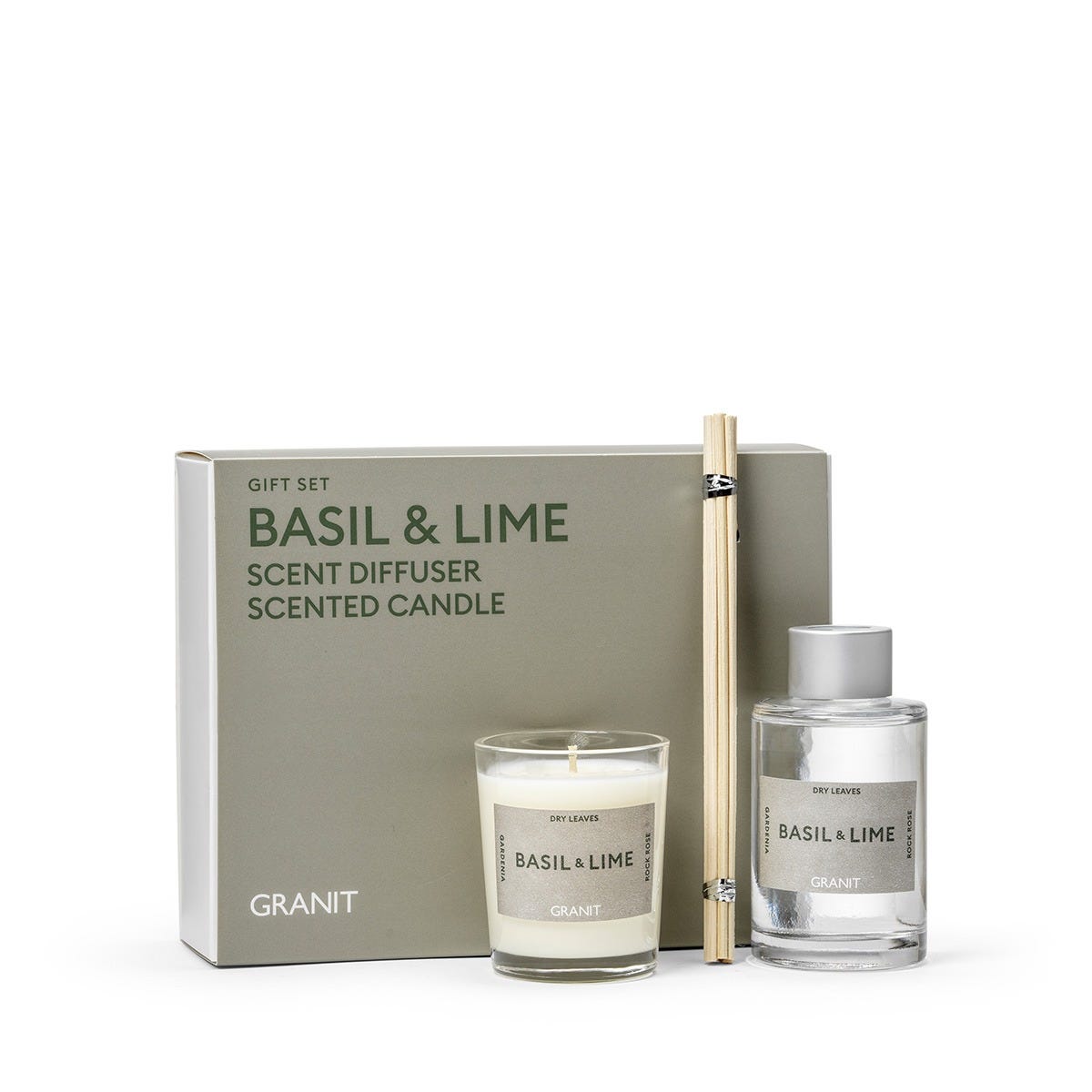 Presentkit med doftljus och doftpinnar med en härlig doft av basilika och lime. Doftljuset innehåller handgjutet sojavax med en blandning av eteriska oljor och diffuserset består av doftolja med dekorativa träpinnar. Doften har toppnoter av lime, bitter apelsin och torra löv. Hjärtnoter av gardenia, grönt gräs och rosmarin och en härlig bas av ros och mysk.Klipp ner veken kort inför varje bränning. Då brinner ljuset med stadig låga och sotar inte
