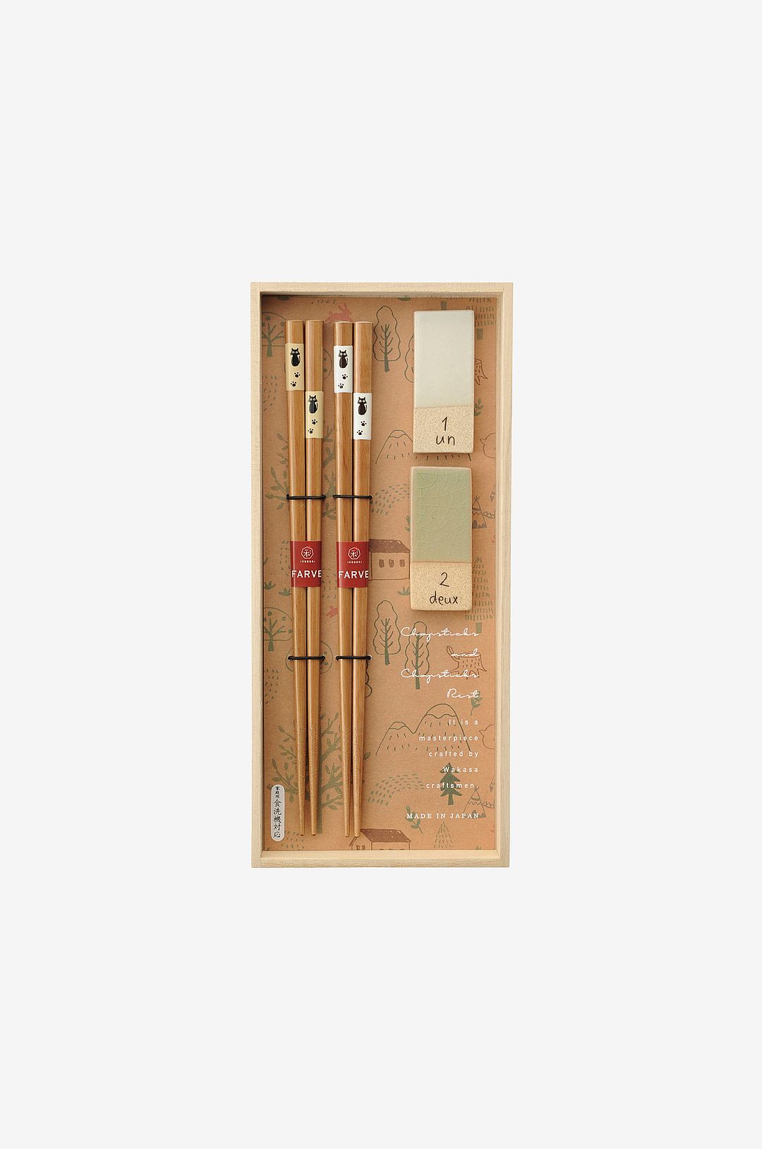 Presentask med två par ätpinnar med söta katter och snygga ätpinnestöd i naturfärger, levereras i en vacker trälåda, tillverkad i Japan, tål maskindisk.