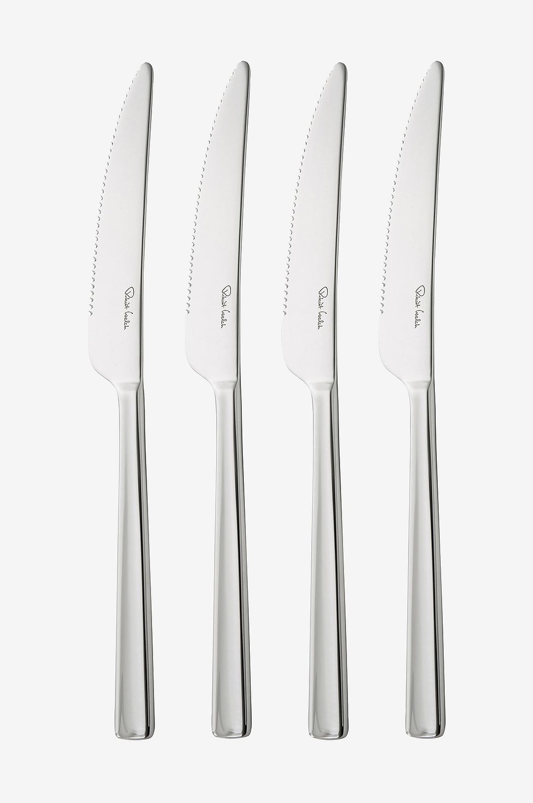 Ett 4-pack steakknivar i serien Blockley från Robert Welch. Blockley är en perfekt balanserad bestickserie med sin raka, linjära design och en liten fördjupning längs hela handtaget som vackert fångar ljuset. Tillverkade i högsta kvalitet 18/10 rostfritt stål. Knivbladen är gjorda av speciellt härdat rostfritt stål för att ge bästa möjliga skäregg. Knivarna är diskmaskinsäkra och har livstids garanti.