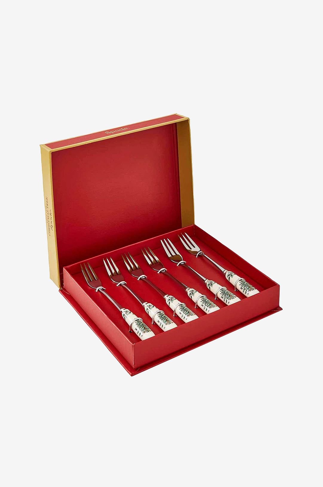 6 st dessertgafflar i serien Christmas Tree från Spode. Av rostfritt stål med ett dekorerat porslinshandtag.
