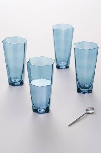 4-pack höga glas av kadmiumfritt glas. I serien AMORY är glasen 6-kantiga och har snygg, avsmalnande form. Serien förgylls av att glasets yta har oregelbunden struktur, kalla drycker känns extra läskande. 49 cl/glas. Vikt 311 g. Material: Glas. Storlek: Höjd 16,5 cm, topp ø 9 cm, botten ø 5,7 cm. Skötselråd: Handdisk. Tips/råd: Var kreativ när du ska duka. Ibland känns det stiligt att vara enhetlig, andra gånger kan det vara spännande att blanda olika glas till varje kuvert.