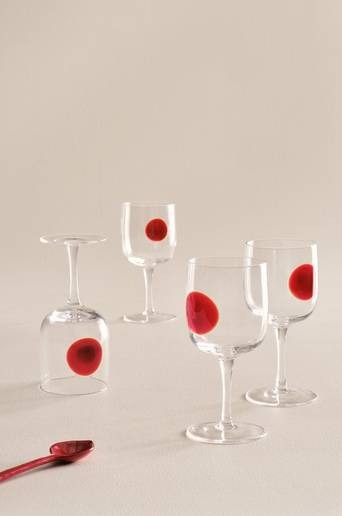 Charmigt vinglas. DART vinglas i 4-pack förhöjer ditt kök och vardagsrum. Klart glas pryds av livfulla prickar. Varje bit är handgjord och unik och berättar sin egen historia. En del av DART-familjen med matchande föremål. Perfekt för trendig och modern hemdesign. Material: glas. Storlek: höjd 17.5 cm, ø 8.5 cm. Volym: 28 cl/glas. Antal i förpackning: 4. Då produkten är handgjord kan små variationer i mönster och finish förekomma jämfört med bilden.