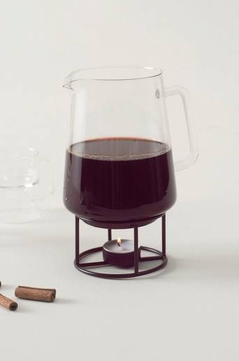 Karaff av klarglas med ställning av järn. Karaffen har lodräta ränder i glaset och ett praktiskt handtag. Ställningen har plats för värmeljus så du kan hålla drycken varm. Ställningen är svartlackerad. Material: Glas. Ställning: Järn. Storlek: Höjd 16 cm, topp ø 9 cm, max ø 12,2 cm, botten ø 9 cm, rymmer 125 cl. Vikt: 320 g. Skötselråd: Tål diskmaskin och mikrovågsugn. Tips/råd: Vill du ha glöggmuggar i samma stil finns det matchande koppar i 8-pack som också heter ILSE.