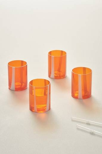 4-pack glas av färgat glas med vertikala oregelbundna ränder i vitt. De raka, färgstarka glasen piggar upp din dukning på ett somrigt och lekfullt sätt och allt från bubblande vatten till läskande måltidsdryck smakar extra gott. Material: Glas. Storlek: Höjd 9,5 cm, ø 7,5 cm, rymmer 35 cl/glas. Vikt: 180 g. Skötselråd: Handdisk. Tips/råd: Duka spännande med en mix av färgstarka glas, gästerna kommer att starta middagen med att le.