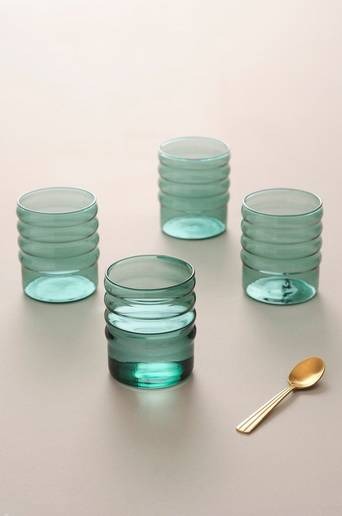 4-pack färgade glas med böljande ränder horisontellt. Färgen och formen tillsammans skapar en spännande mix som känns både ny och nostalgisk. Material: Glas. Storlek: Höjd 10,3 cm, ø 8,3 cm, rymmer 45 cl/glas. Vikt: 115 g/glas. Skötselråd: Handdisk. Tips/råd: Förstärk festkänslan med textilservetter och servettringar som stämmer med FLEUR och resten av din dukning.