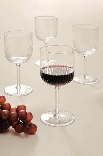 4-pack rödvinsglas i läcker form som gör serien RONYA riktigt festlig. Glaset har också fint reliefmönster som ger en lite gammaldags och handblåst känsla. Detta rödvinsglas passar perfekt så snart du vill fira något, allt från bröllop till nyår. Material: Glas. Storlek: Höjd 18 cm, topp ø 9 cm, fot ø 9 cm, rymmer 45 cl/glas. Vikt: 216 g/glas. Skötselråd: Handdisk. Tips/råd: Skapa en vacker dukning med tygservetter till de fina glasen. Välj servetter som passar ditt tema på dukningen.