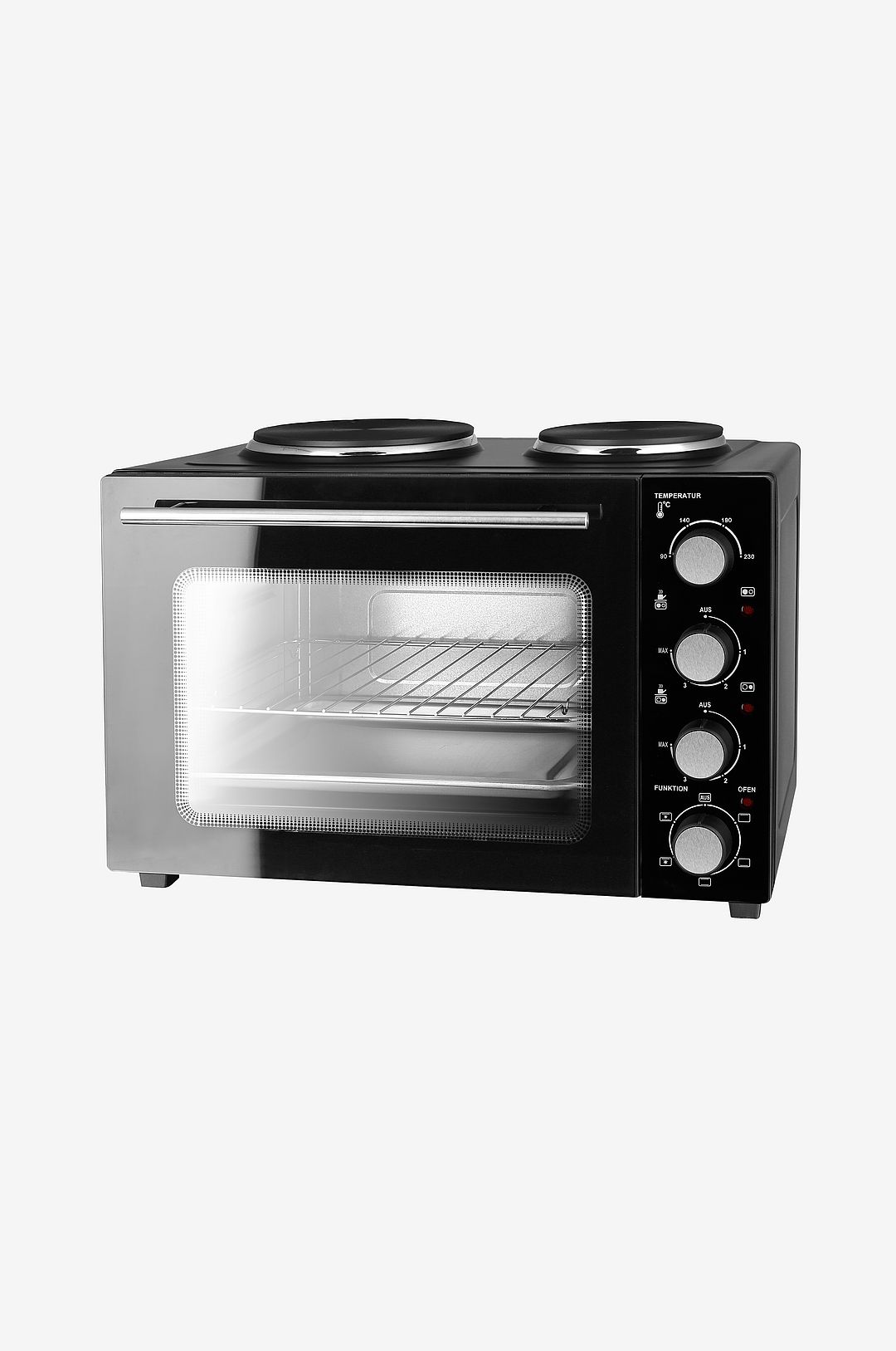 Liten ugn med stor kapacitet och 2 kokplattor. Den har alla funktioner som en stor ugn men i ett mindre och mer lätthanterat format. Perfekt för det lilla hemmet, på campingen eller i sommarstugan. Specifikationer: · Effekt 3200W. · Kapacitet 32 liter. · 2 kokplattor. · Justerbar termostat. · Ugnstemperatur 90-230°. · Över- och undervärme. · Indikatorlampa. · Värmeelement i rostfritt stål. · Bakplåt, galler och handtag. · Belysning. · BPA-fri.