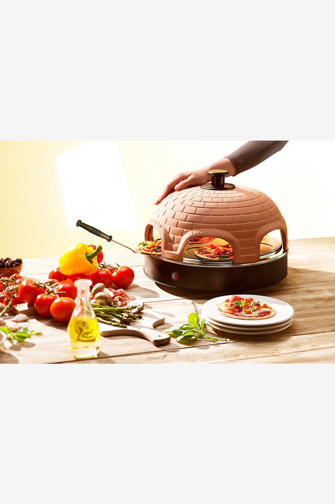Trevlig och effektiv pizzaugn för rolig matlagning i sällskapet. med en realistisk och handgjord terrakotta-topp får du känslan av att du bakar dina pizzor i en riktig pizzaugn. De egna minipizzorna tillagas med de 6 medföljande spatlarna och pizzabakningen direkt på matbordet blir ett rent sällskapsnöje. designen är stilren med en handgjord terrakotta-topp, ett värmetåligt handtag och en sval utsida. De 6 pizzaspadlarna är tillverkade av rostfritt stål med isolerade handtag. Själva ugnsytan är tillverkad av rostfritt stål och det finns även en indikatorlampa på den nedre delen. En praktisk form för att ta ut minipizzor i rätt storlek ingår också. Med denna fina pizzaugn blir matlagning ett rent nöje. Ställ fram många olika tillbehör och gör enkelt dina egna välsmakande minipizzor i din egen pizzaugn, direkt på matbordet. Mycket socialt och extra gott. effekt: 1200 w handgjort lock i terrakotta yta i rostfritt stål 6 pizzaspatlar indikatorlampa form för pizzadeg sval utsida Fri från bpa