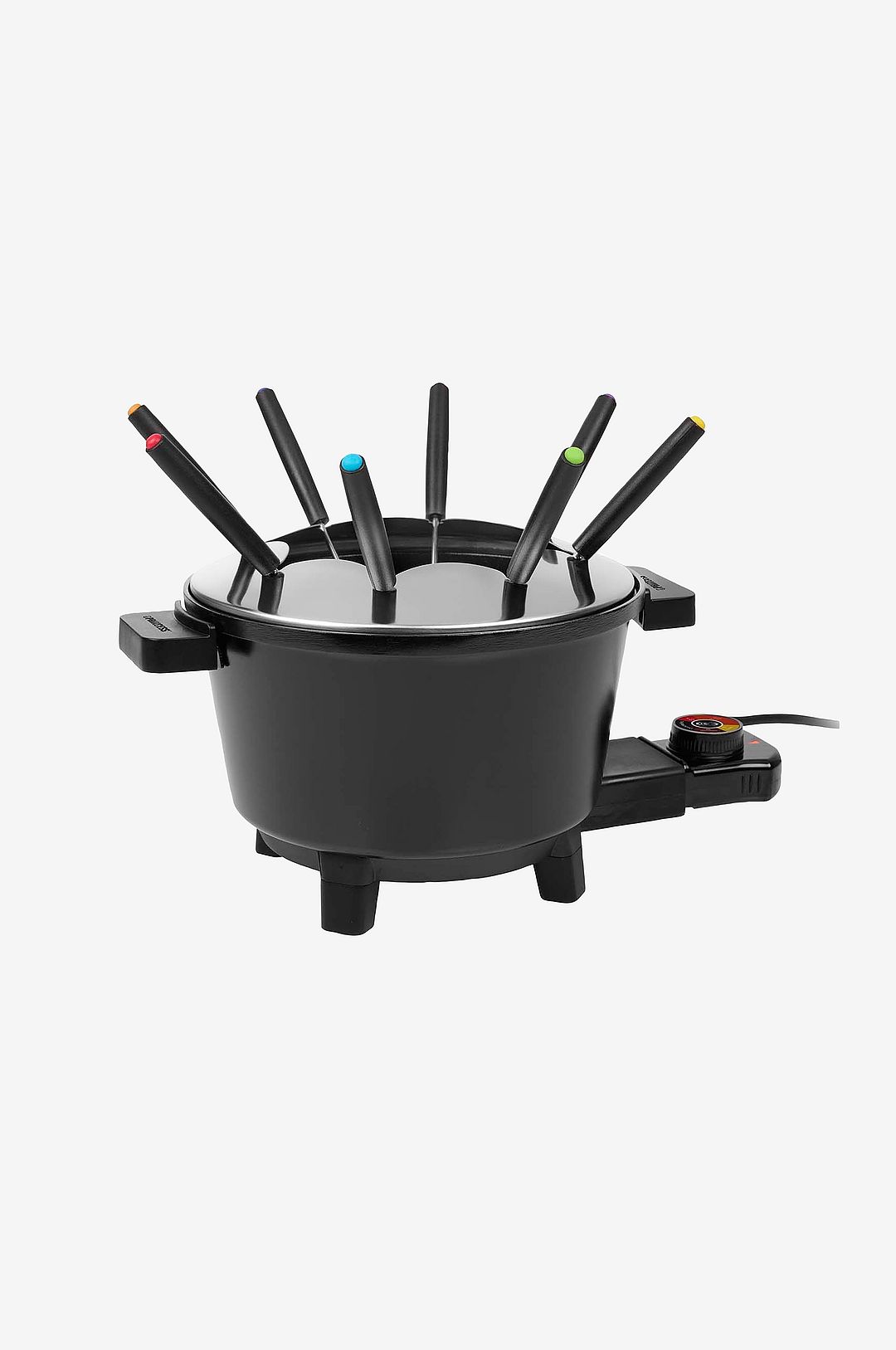 · Stor fonduegryta på 1,5 liter · Justerbar termostat · Inklusive 8 gafflar i rostfritt stål · Slitstark keramisk beläggning · Cool-touch handtag · Avtagbar sladd med termostat · Fonduering ingår · Indikator för maxinnehåll · Lätt att rengöra · Halkfria fötter · Indikatorlampor för ström · 2 m strömkabel · Lämplig för olja, choklad, ost · Effekt: 800 W.