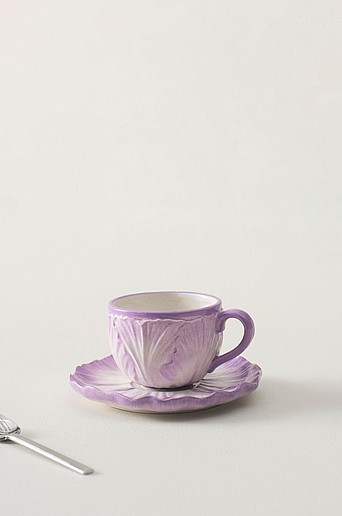1-pack som innehåller en mugg och ett fat. Setet är handgjort av dolomitporslin, både form och färg för tanken till en blommande viol. Den blanka glasyren är handmålad och det fina hantverket gör varje del unik. Dukningen blir ljuvlig med dessa somriga muggar med fat. Material: Dolomitporslin. Storlek: Mugg höjd 7 cm, ø 8 cm, bredd inkl. öra 11,5 cm, rymmer 20 cl. Fat ø 15 cm. Skötselråd: Handdisk. Tips/råd: Flora gör sig fint i vitrinskåpet, som ett litet smycke.