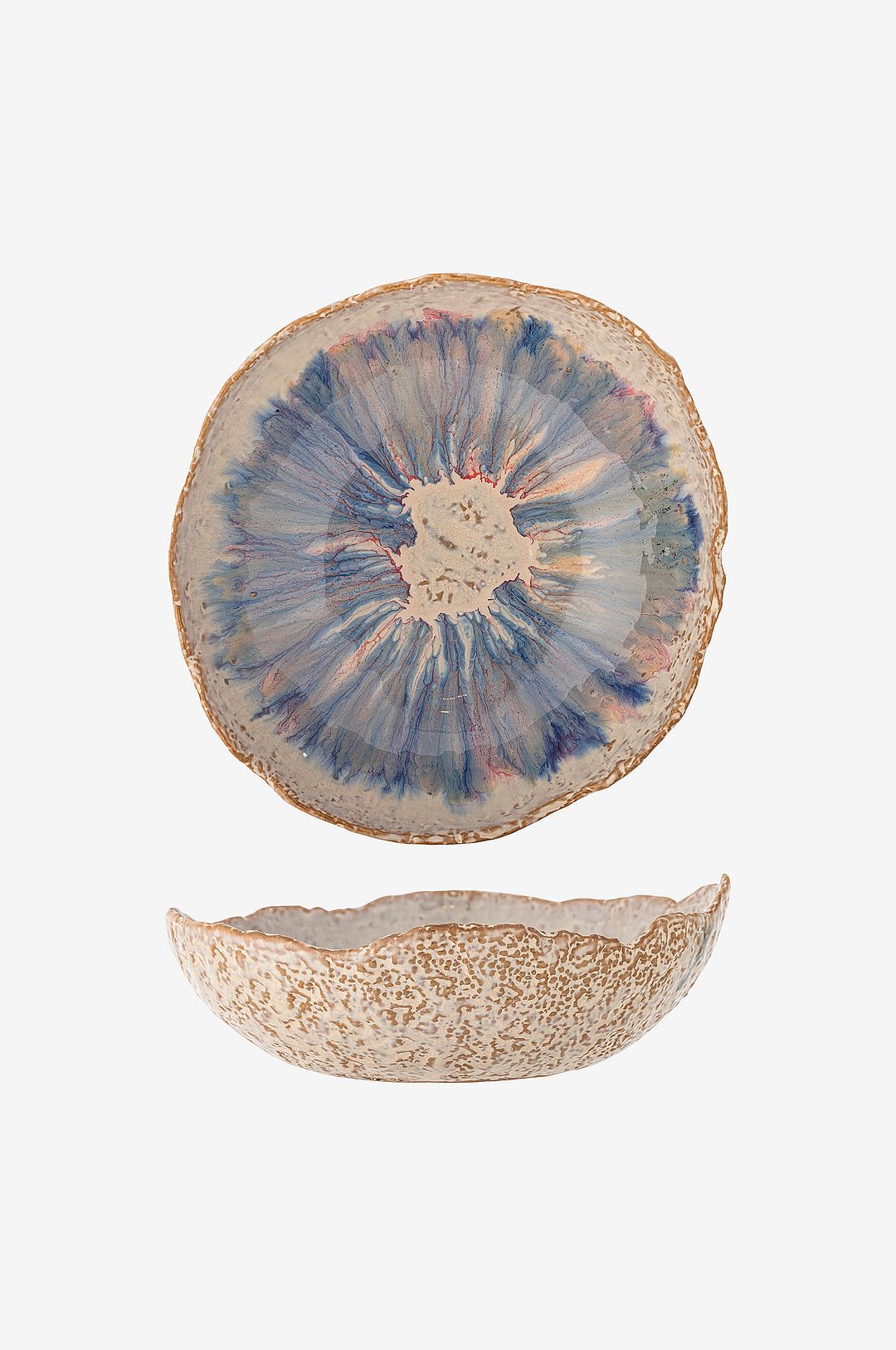 amalia bowl från bloomingville presenterar ett mjukt färgspel mellan beige, lila och blå nyanser som vackert smälter samman till en akvarellliknande palett. Skålen har en böjd form och en glansig yta, vilket gör den perfekt som en del av middagsbordet. De rustika kanterna ger karaktär och framhäver skålens unika uttryck. Glasyren kan ge variationer i färgen. Mått: d24xh8 cm. 1400 ml.