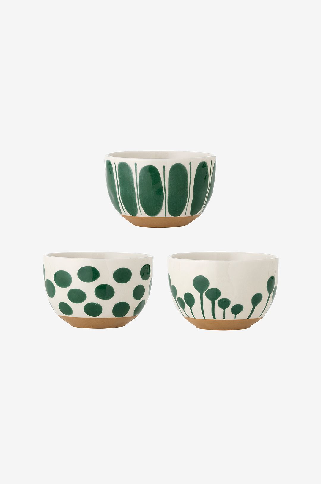 linora bowls från creative collection är ett set med 3 vackra skålar i stengods, var och en dekorerad med unika mönster i mörkgröna nyanser. Med sin naturliga, oglaserade bas skapar de en rustik och kontrasterande detalj som ger karaktär åt ditt kök. Skålarna är perfekta för servering av snacks, frukostflingor eller små sallader och kan även användas som dekorativa element i hemmet. Mått: d12,5xh8 cm, set om 3