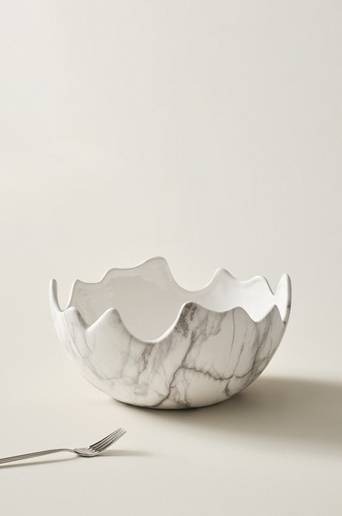 Magisk skål av dolomitporslin som glaserats likt marmor. Den oregelbundna kanten upptill gör skålen extra vacker. Glasyren är blank och insidan har enfärgad glasyr. MARBLE är magisk både till sallader och som fruktskål. Material: Dolomitporslin. Storlek: Höjd 15 cm, ø 30 cm. Skötselråd: Handdisk. Tips/råd: MARBLE är en vacker skål att servera snacks i på festen.