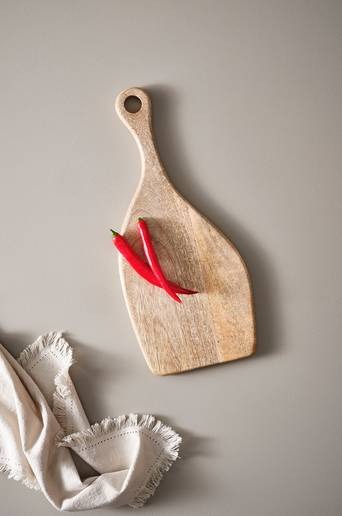 Skärbräda av FSC-certifierat mangoträ med vacker ådring. Den mjuka ytan är obehandlad och varje skärbräda är unik då träet har naturliga variationer. Vacker, asymmetrisk form med behagligt rundade kanter. Handtaget har ett hål. Skärbrädan är ett praktiskt och snyggt uppläggningsfat när du serverar både frukost och middag. Skärbrädan är livsmedelssäker. Produkten består av trä som är avverkat från ett ansvarsfullt, kontrollerat och mer hållbart skogsbruk som tar hänsyn till människor och miljö. Material: Mangoträ. Storlek: 20×46 cm, höjd 1,5 cm. Skötselråd: Handdisk, torkas torr. Tips/råd: Skärbrädan MEGGI är dekorativ att hänga på väggen och på så sätt alltid ha den nära till hands samtidigt som du spar plats i lådor och skåp.