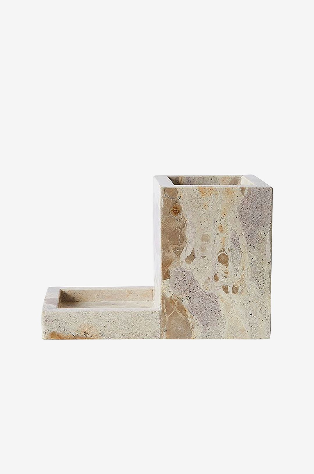 Vita är en serie extraordinära kökstillbehör som förhöjer inredningen med ett starkt och vackert stycke natur. Diskborstehållaren tillför stil och elegans till de dagliga rutinerna hemma och den är perfekt att placera vid diskbänken – både som ett dekorativt element och som en fin förvaringslösning för diskborstar, diskmedel och trasor. Kan även användas på kreativa sätt i badrummet, på kontoret eller i barnrummet. Diskborstehållaren är tillverkad av marmor. Den naturliga variationen i färger och mönster gör varje Vita-produkt unik och skapar en vacker kontrast mot övriga material i ditt kök. Observera: Eftersom marmor är ett naturmaterial kan små variationer förekomma från produkt till produkt. Tål inte diskmaskin. Istället bör produkten handtvättas med neutral tvål, eftersom stark och sur tvål kan skada den naturliga marmorn.