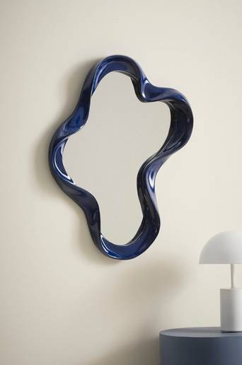 Handgjord spegel i oregelbunden form med flytande känsla och färgstark ram, som ger spegeln karaktär. Spegeln hängs på väggen och har hål för upphängning på ett sätt på baksidan. Det fina hantverket gör varje spegel unik. Material: Polyresin och glas. Storlek: Höjd 61,5 cm, bredd 46 cm, djup 7 cm. Skötselråd: Torkas av med lätt fuktad trasa och fönsterputs. Tips/råd: Piggar upp din hall på ett färgglatt sätt.