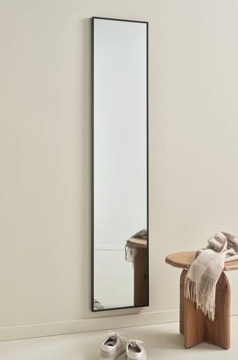 Rektangulär spegel med smäcker aluminiumram. Ramen har dold förstärkning av MDF. Tre dolda hängare på baksidan, så spegeln kan hängas både vågrät och lodrät. Denna spegel passar även bra i badrum och våtutrymmen. Material: Aluminium, MDF och spegelglas. Storlek: 35×170 cm. Skötselråd: Torkas av med lätt fuktad trasa och glasputs. Tips/råd: En spegel på väggen är dekorativt och praktiskt, samtidigt som det gör att ett litet utrymme upplevs större.