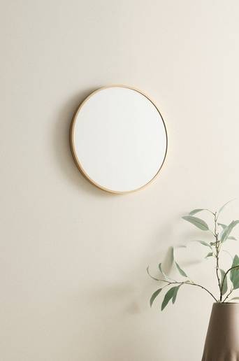 Rund spegel med smäcker aluminiumram. Baksidan är av MDF. Dold hängare på baksidan. Denna spegel passar även bra i badrum och våtutrymmen. Material: MDF, aluminium och spegelglas. Storlek: ø 40 cm. Vikt: ca 3 kg. Skötselråd: Torkas av med lätt fuktad trasa och glasputs. Tips/råd: En spegel på väggen är dekorativt och praktiskt, samtidigt som det gör att ett litet utrymme upplevs större, till exempel en hall eller en toalett.