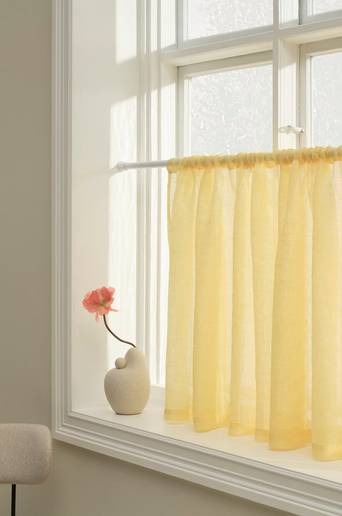 Cafégardinen ELLEN i linneväv lyfter din interiör och ger en uppfriskande blandning av avslappnad elegans och avskildhet. Linnetyget utstrålar en naturlig charm och designen gör det enkelt att hänga upp gardinen på en gardinstång, perfekt för en ljus inredning med en touch av intimitet. Hängs på gardinstång nedtill i ditt fönster och ger på så sätt insynsskydd samtidigt som ljuset kommer in ovanför gardinen. Linne är ett fint naturmaterial som blir mjukare och mer följsamt med tiden. Ett tips för att få ett extra mjukt och fint fall är att använda en steamer när du hänger linnegardinerna på plats. Steamern kombinerar värme med ånga och gör gardinerna mer flexibla. Licensnummer & testinstitut: PEE AAA Impex Eu Flax BVFR15152366 Bureau Veritas. European Flax-certifierat lin, vilket innebär att produkten innehåller lin i hög kvalitet odlad med hänsyn till miljön och med spårbarhet i hela produktionsprocessen från planta till fiber. Material: 100% Lin. Storlek: 75 x 250 cm. Gramvikt: 80 g/m². Upphängningsmetod: gardinstång. Antal i förpackning: 1 st. Maskintvätt i 40°C. Använd inte blekmedel. Torktumla ej. Strykning hög temp. Högsta temp. 200°C. Kemtvätt (ej trikloretylen). Krympning max 5-7 %. Förläng livstiden på gardinerna genom att dammsuga dem försiktigt med mjukt munstycke med jämna mellanrum. På så vis undviker du att damm och smuts tränger in i tyget. Dessutom behåller dina gardiner färgen längre. Fläckar tas bort med varmt vatten på en ljus trasa. Dutta fläcken försiktigt med trasan, steama och låt torka.