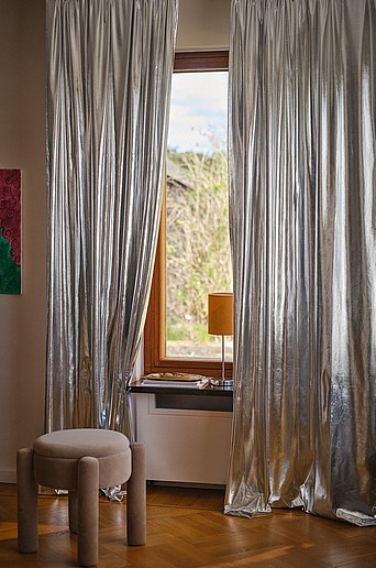 Två kanallängder i silverfärgat stretchtyg av polyester med liten inblandning av elastan. Dessa gardiner är mycket speciella och tyget är mjukt och elastiskt, trots att de kan ge en lite metallisk känsla med sin läckra silverfärg. Varje längd har 5 cm kanal. Material: 95% polyester, 5% elastan. Storlek: Bredd per gardinlängd 140 cm. Välj längd vid beställning. Skötselråd: Handtvätt. Tips/råd: Förstärk rymdtemat och matcha med en läcker lampa som för tanken ut i universum.