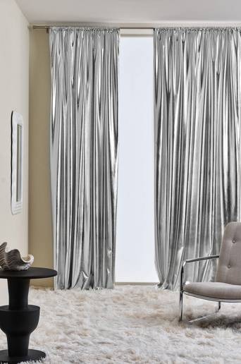 Två kanallängder i silverfärgat stretchtyg av polyester med liten inblandning av elastan. Dessa gardiner är mycket speciella och tyget är mjukt och elastiskt, trots att de kan ge en lite metallisk känsla med sin läckra silverfärg. Varje längd har 5 cm kanal. Material: 95% polyester, 5% elastan. Storlek: Bredd per gardinlängd 140 cm. Välj längd vid beställning. Skötselråd: Handtvätt. Tips/råd: Förstärk rymdtemat och matcha med en läcker lampa som för tanken ut i universum.