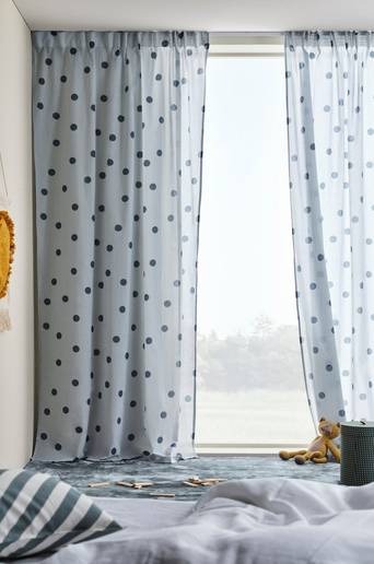 Två gardinlängder i bomull med tryckt prickmönster ton i ton. Prickigt är mönsterbilden som aldrig går ur tiden, en äkta klassiker. Längderna har påsytt multifunktionsband och kan hängas upp med fingerkrokar, kanal samt dold hälla. Jotex samarbetar med Better Cotton för att förbättra bomullsodlingar över hela världen. Better Cotton är en global, ideell organisation som utbildar bomullsodlare i metoder för en mer hållbar bomullsodling och arbetar för en mer effektiv användning av vatten och minskad användning av bekämpningsmedel. Better Cotton ger bomullsodlare förbättrade sociala, ekonomiska och miljömässiga villkor. Genom att välja våra bomullsprodukter stödjer du vår investering i Better Cottons uppdrag. Better Cotton ingår i ett massbalanssystem och kan inte fysiskt spåras till slutprodukter. För mer information om Better Cotton, besök bettercotton.org/learnmore Material: 100% bomull. Storlek: Bredd 140 cm per gardinlängd. Välj längd vid beställning. Skötselråd: Tvätt 40°. Krympning max 5%. Tips/råd: Förnya med en gardinstång med ändknoppar som matchar rummet. Du hittar massor att välja bland här på Jotex.